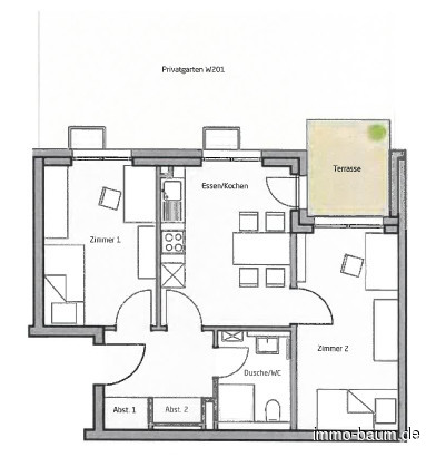 Bad mit DuscheEinbaukücheWohn-EsskücheZimmer 1Zimmer 2DieleStauraum in der DielePrivatgarten mit Terrasse